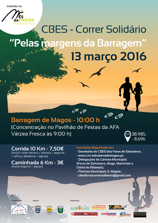O “CBES Correr Solidário – Pelas margens da Barragem” irá realizar-se no dia 13 de Março de 2016, com início às 10h, nas margens da Barragem de Magos. A concentração irá decorrer no Pavilhão de Festas da AFA da Várzea Fresca às 9h.